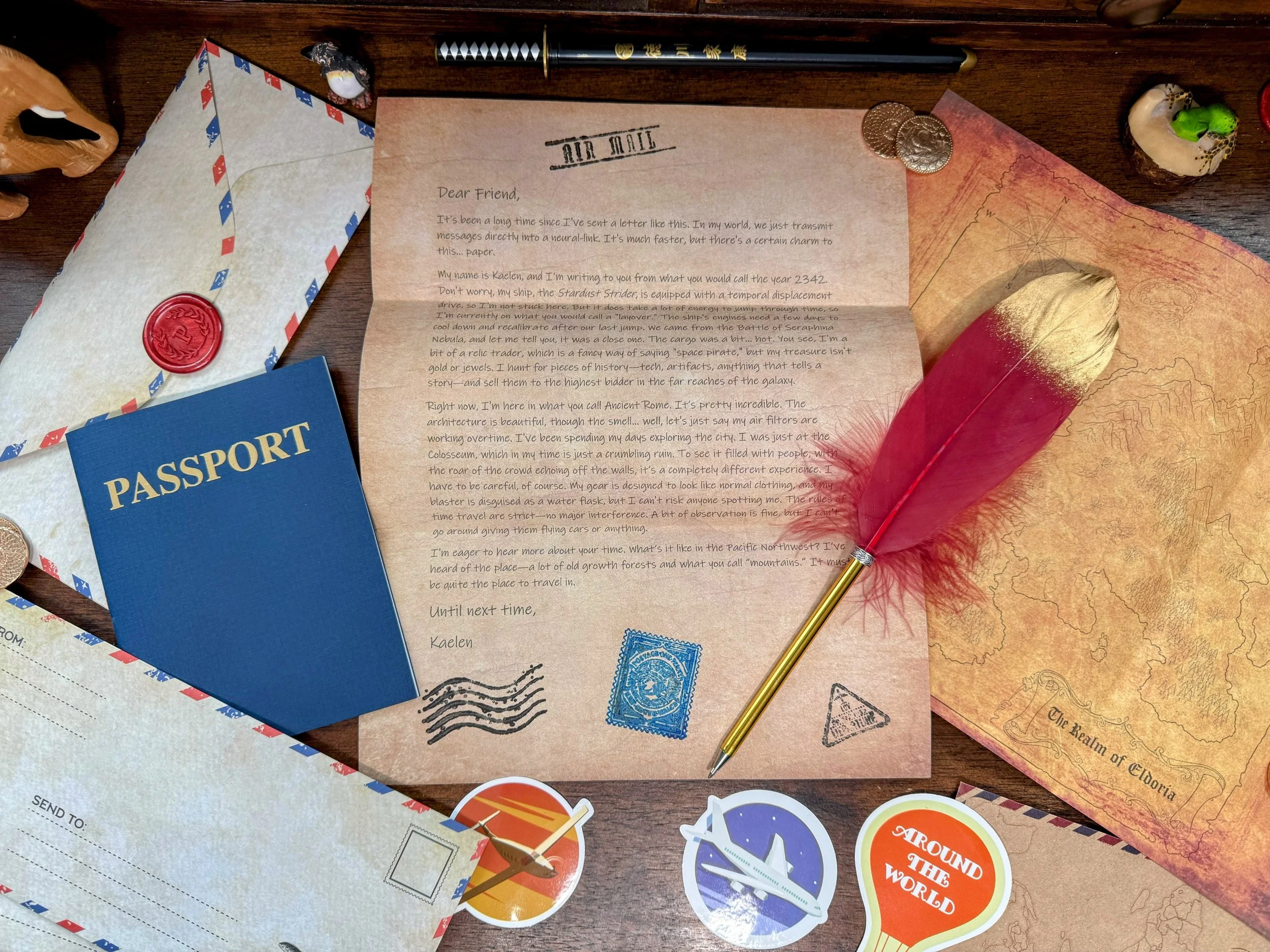 The Explorer's Provisions: A genuine brass pocket compass, real feather pen, and a bound Traveler’s Journal shipped with your first dispatch.